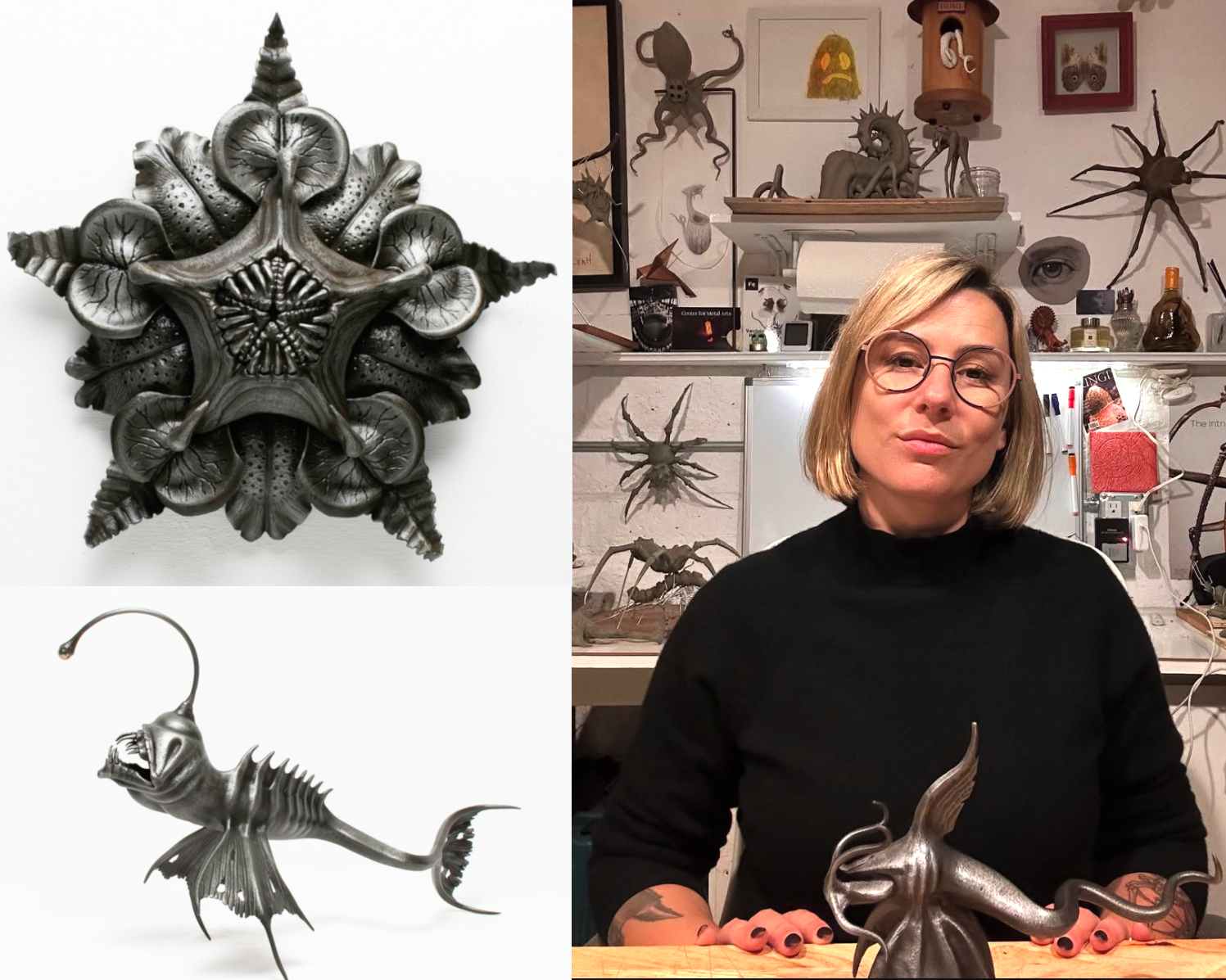 Upon graduating, she began a paid apprenticeship in a commercial fabrication shop under her mentor, Brian Martin. Three years later, she opened her own metal shop where she has since focused exclusively on making art. Her work has gone down the runway at Mercedes Benz Fashion Week, featured in various magazines and publications, and displayed in museums across the country, including the National Museum of Metal, the Fuller Craft Museum, Haggin Museum, and the DeYoung. A forever student of the metal arts, she continues to train and learn under masters of the craft and is constantly pursuing the equipment and knowledge necessary to push the limits of what can be hand built in steel. She lives in Oakland with her husband and two cats and builds monsters and aliens out of her metal shop.
